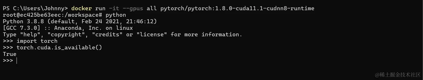 docker run -it pytorch/pytorch:1.8.0-cuda11.1-cudnn8-runtime