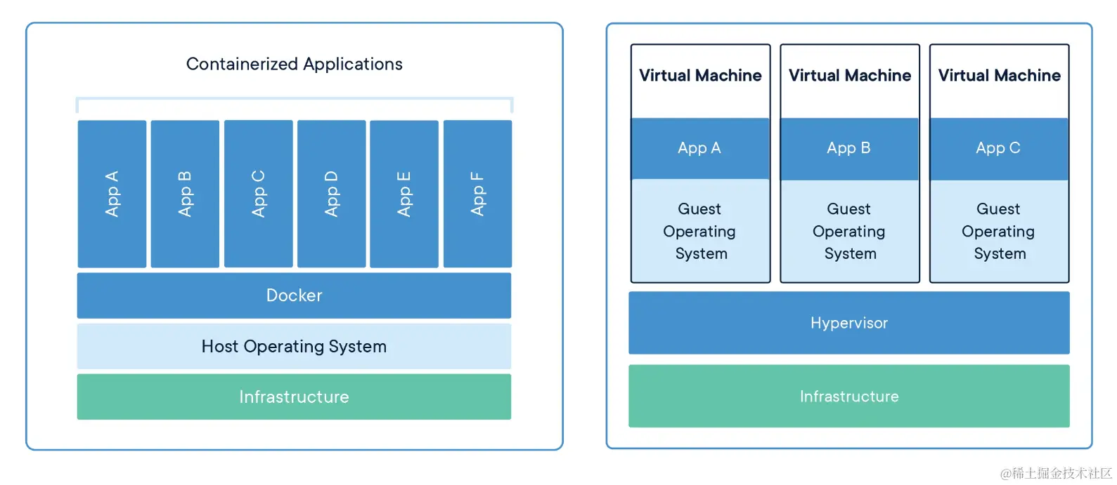 可以看下图右边就是虚拟机架构,每个虚拟机都有自己的系统,而Docker(左)架构,是应用层的抽象,多个容器与其他容器共享一个操作系统内核,这样占用的资源比虚拟机少很多。