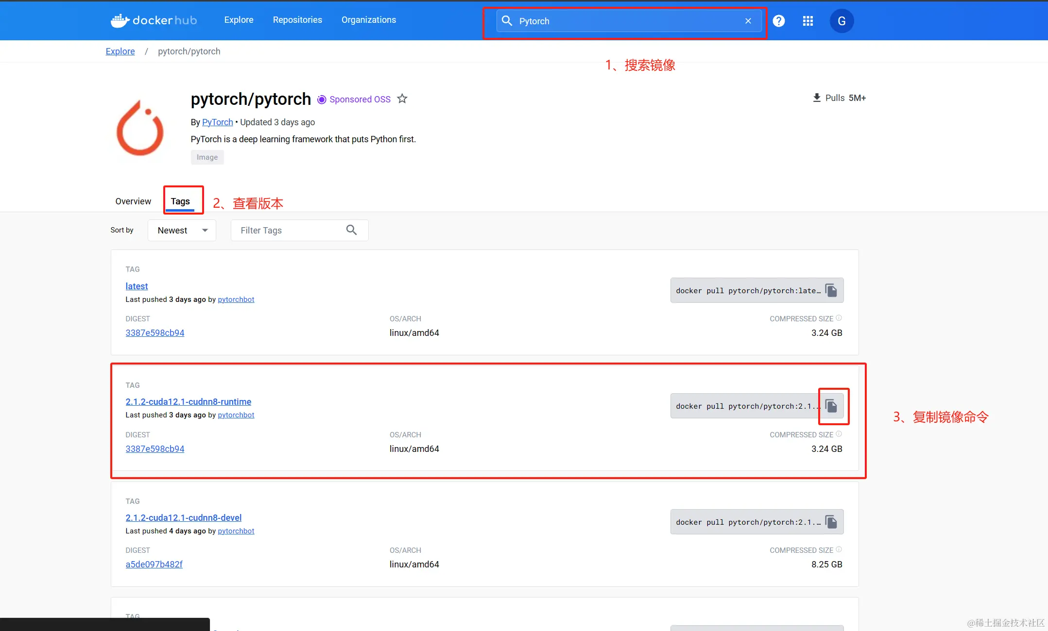 Docker Hub给我们准备了很多好用的镜像,像Pytorch、TensorFlow都准备了自己的镜像,里面配置了cuda、cudnn和python,我们选一个需要的就行。