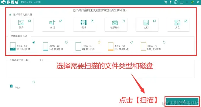 第1步:点击【免费试用】后进入软件,用户对需要扫描的文件类型进行勾选(支持多选或全选),并对需要扫描的磁盘进行勾选,点击 【扫描】 ;