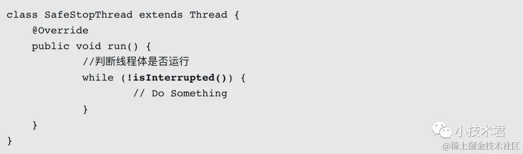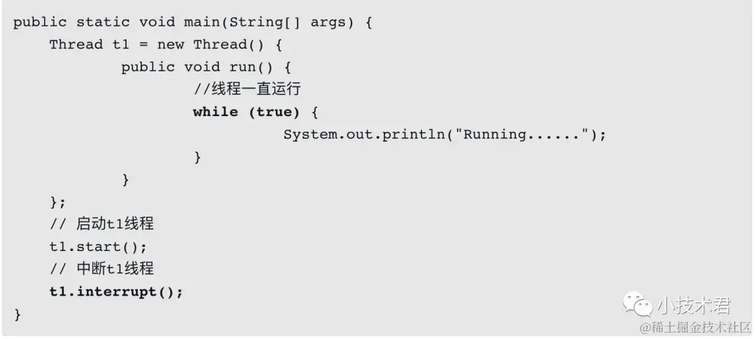 这是很简单的办法,在线程体中判断是否需要停止运行,即可保证线程体的逻辑完整性,而且也不会破坏原子逻辑。可能有读者对Java API比较熟悉,于是提出疑问:Thread不是还提供了interrupt中断线程的方法吗?这个方法可不是过时方法,那可以使用吗?它可以终止一个线程吗?非常好的问题,interrupt,名字看上去很像是终止一个线程的方法,但是我可以很明确地告诉你,它不是,它不能终止一个正在执行着的线程,它只是修改中断标志而已,例如下面一段代码: