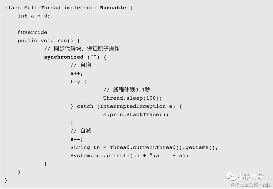 MultiThread实现了Runnable接口,具备多线程能力,其中run方法中加上了synchronized代码块,表示内部是原子逻辑,它会先自增然后再自减少,按照synchronized同步代码块的规则来处理,此时无论启动多少个线程,打印出来的结果都应该是a=0,但是如果有一个正在执行的线程被stop,就会破坏这种原子逻辑,代码如下: