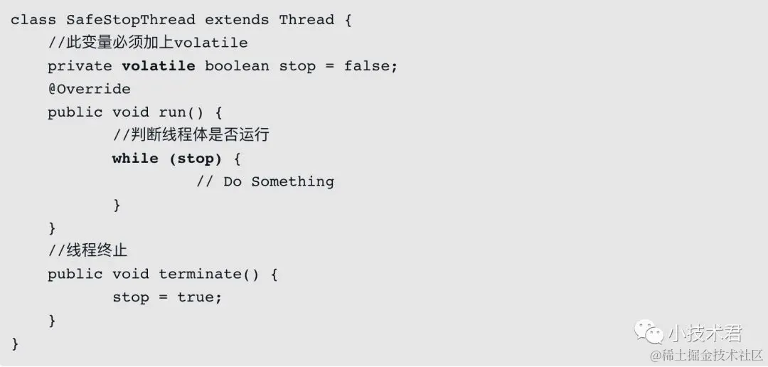 总之,如果期望终止一个正在运行的线程,则不能使用已经过时的stop方法,需要自行编码实现,如此即可保证原子逻辑不被破坏,代码逻辑不会出现异常。当然,如果我们使用的是线程池(比如ThreadPoolExecutor类),那么可以通过shutdown方法逐步关闭池中的线程,它采用的是比较温和、安全的关闭线程方法,完全不会产生类似stop方法的弊端。