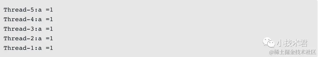 首先要说明的是所有线程共享了一个MultiThread的实例变量t,其次由于在run方法中加入了同步代码块,所以只能有一个线程进入到synchronized块中。此段代码的执行顺序如下:1)线程t1启动,并执行run方法,由于没有其他线程持同步代码块的锁,所以t1线程执行自加后执行到sleep方法即开始休眠,此时a=1。2)JVM又启动了5个线程,也同时运行run方法,由于synchronized关键字的阻塞作用,这5个线程不能执行自增和自减操作,等待t1线程锁释放。3)主线程执行了t1.stop方法,终止了t1线程,注意,由于a变量是所有线程共享的,所以其他5个线程获得的a变量也是1。4)其他5个线程依次获得CPU执行机会,打印出a值。分析了这么多,相信读者也明白了输出的结果,结果如下: