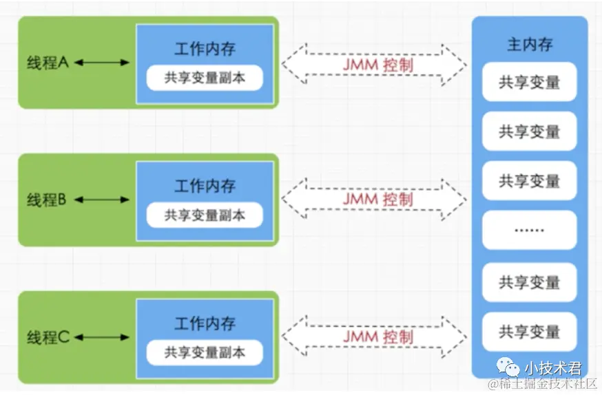 如果线程Thread-1在自己的本地内存中修改共享变量的副本时如果不及时刷新到主存并通知Thread-2从主存中重新读取的话,那么Thread-2将看不到Thread-1所做的改变并仍然我行我素的操作自己内存中的共享变量副本。这也就是我们常说的Java内存模型(JMM)。