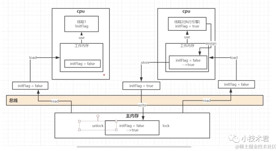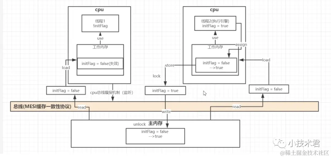 失效掉线程1的工作内存中变量,当线程1 再次使用initFlag 变量的时候就会再次load 主内存的数据,从而获取到最新的数据, 但是会有人会有这样的疑问:线程2的数据经过总线 store 主内存,这个时候已经触发总线上的嗅探导致线程1读的数据还是一开始的值,因为 线程2 的write还没有执行,所以这个时候就有了在store过程的加锁lock,避免这个问题如下图所示,只有主内存write 结束, 这个主内存变量才会被其余线程所访问,这个加锁的粒度是非常非常小的!这也是volatile关键字的底层大概实现原理.