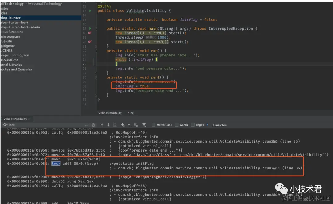 出现这个结果对于了解过JMM的应该是毫无意外! 线程1 的 isFlag变量还是false! 并没有收到线程2 isFlag=true 的影响! 其实解决这个很简单再变量上加volatile关键字即可!,但是为什么volatile 可以实现不同线程之间变量的可见呢? 我们接下来结合流程图以及代码和汇编代码来解释.