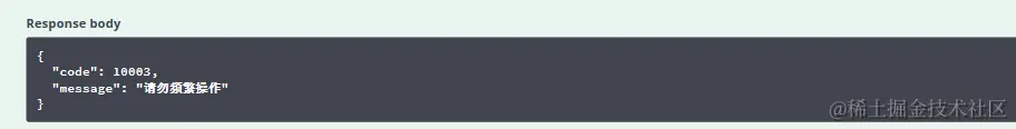 在本次测试中我们将锁的超时时间设置为 10 秒钟,在接口中让当前线程睡眠 10 秒,这样可以保证 10 秒钟之内锁不会被释放掉,测试起来更加容易些。启动项目后,我们快速访问两次该接口,注意两次请求的 channel 传值需要一致(因为锁的 key 中包含该值),会发现第二次访问时返回如下结果: