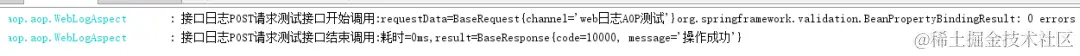 第 7 步,最后,启动项目,然后打开 Swagger 文档进行测试,调用接口后在控制台就会看到类似图 1 这样的日志。