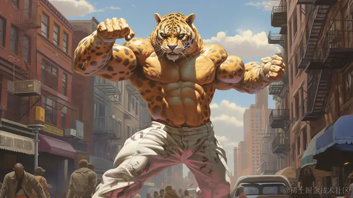 一只肌肉发达的豹子,脚踏在城市街道上。采用Oliver Wetter的风格,融入嘻哈美学、纽约学派、街头风格、杉森建的元素。以超写实的表现形式和时尚的服装设计呈现。