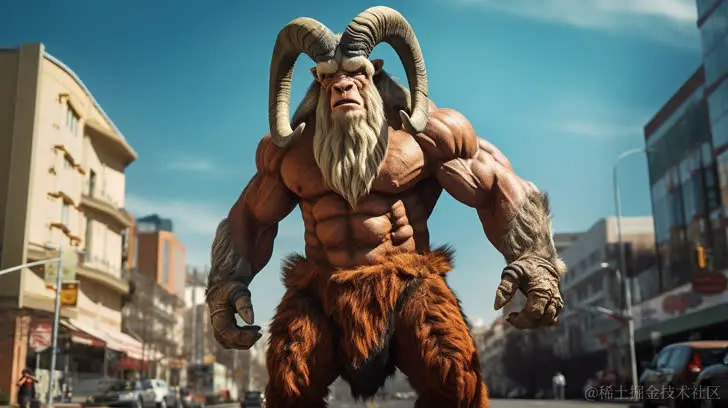 一位10米高、肌肉强壮的山羊人走在街头。以超级英雄为风格,融入Rudolph Belarski的元素,橙色和深红色的调色,漫威漫画、动物主题以及青铜朋克的元素。