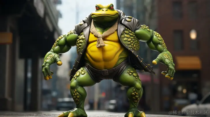 一只身穿明黄衣物、高10米的深绿色青蛙,漫步在城市街道上。采用写实城市风景、超级英雄、暗银和浅海军蓝的风格,融入漫画艺术、恐龙朋克、青铜朋克,表现出强烈的面部表情。