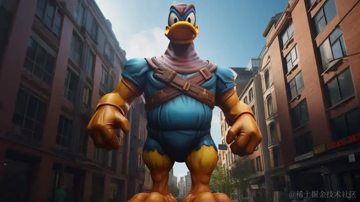 一只10米高、肌肉发达的鸭子站在城市街头。采用罗布·利菲尔德的风格,深褐色和橙色的调色,具备写实的细节,融入Tiago Hoisel的元素、深黄和深蓝绿的色彩,展现出巨大的尺度和轰炸朋克的氛围。