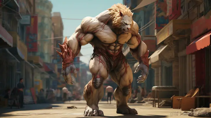 一位街头行走的肌肉虎人,采用超现实的动物混合风格,青铜朋克、Raphael Lacoste、漫画艺术、Igor Kieryluk、Shwedoff的元素。呈现出强烈的面部表情。