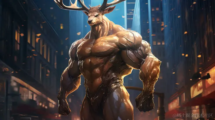 一位肌肉发达、手臂强壮的鹿人在城市外摆姿势。采用混合生物构图、超写实、光泽闪亮的风格,呈现出强烈的光影效果。