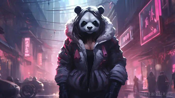 一只10米高、肌肉发达的大熊猫女孩,漫步在街头。采用赛博朋克写实风格、Artgerm、漫画艺术、雪景和街头时尚的元素。