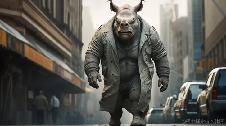 一只肌肉发达、高5米的犀牛,行走在熙熙攘攘的街头。采用街头写实风格,融合漫威漫画、Tiago Hoisel、Anton Semenov、Abdel Hadi al Gazzar等元素。作品具备时尚的服装设计和泡沫朋克的氛围。