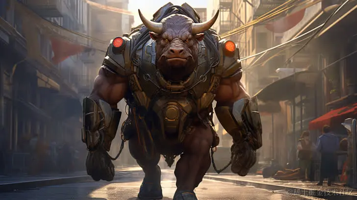 一只10米高的强壮牛头人走在街头,背负着一个包裹。以赛博迷幻朋克为风格,具有照片般真实的夸张效果,融入机甲动漫、青铜色调、兔子朋克、苏联元素以及犬类朋克。