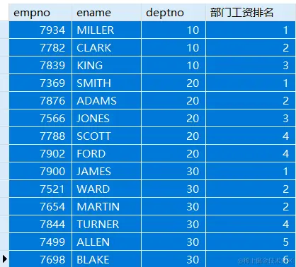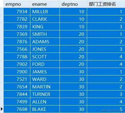 RANK() OVER(PARTITION BY deptno ORDER BY sal) '部门工资排名',