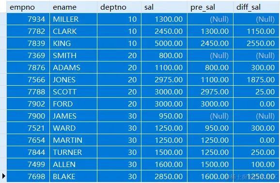子查询中的pre_sal即为上一个记录的薪资。将1改为2即为上两个记录的工资,找不到相应的记录结果为NULL。