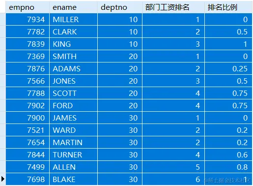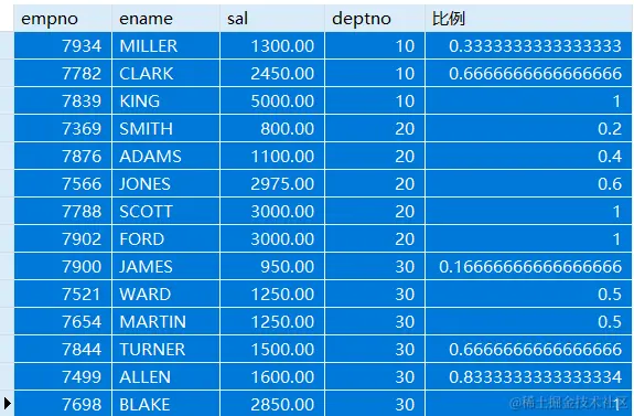 SELECT empno,ename,sal,deptno,CUME_DIST() OVER(PARTITION BY deptno ORDER BY sal ASC) '比例'