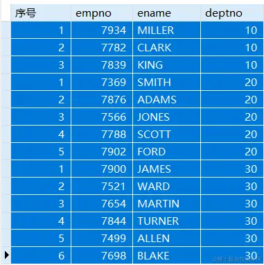 SELECT ROW_NUMBER() OVER(PARTITION BY deptno ORDER BY sal) 序号,empno,ename,deptno