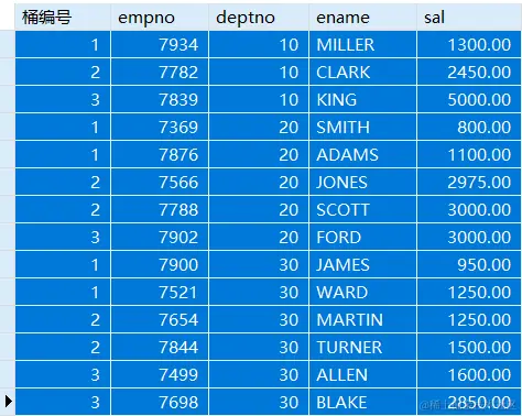 SELECT NTILE(3) OVER w 桶编号,empno,deptno,ename,sal