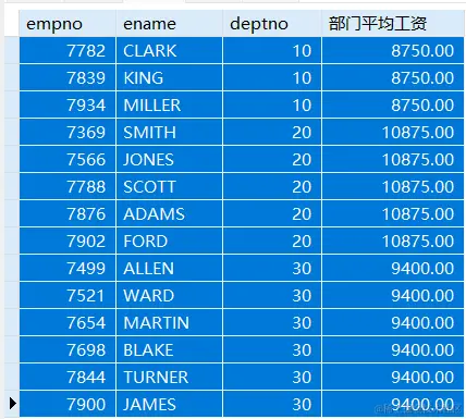 可以发现,查询中确实对数据进行了分组,但是只是将每个组并列在了一起,然后在每个员工的后面显示其部门平均工资