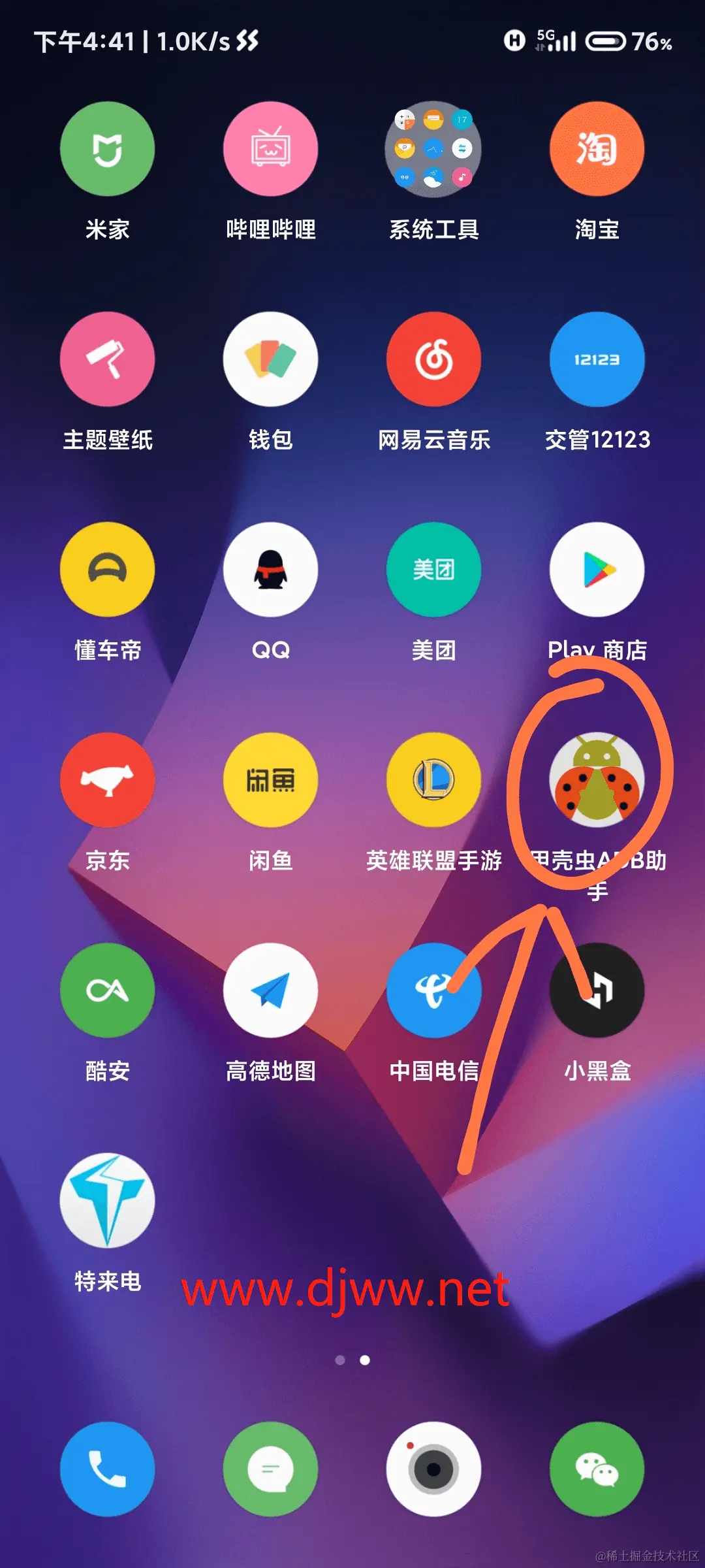 - 手机上安装甲壳虫ADB助手,下方有安装包,直接下载安装到自己手机上即可(参考下图)