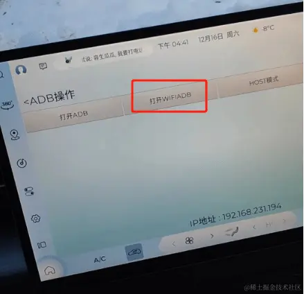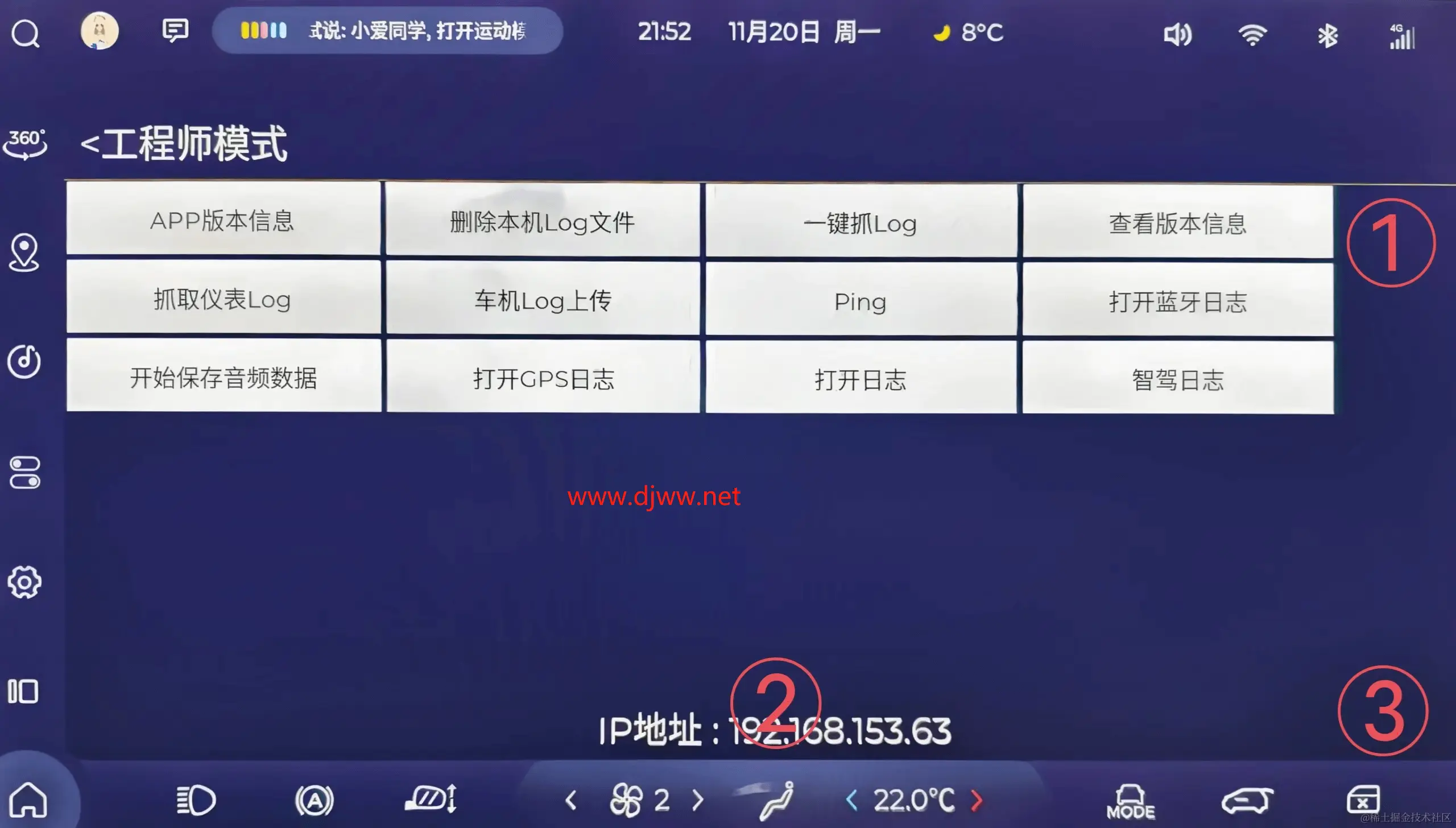 - 点击10次之后我们会进入工程师模式,大家看一下下图中的123号点,我们在车机上按照1223331的顺序(前面的视频里有教)点击这三个位置就可以直接进入隐藏的adb设置页面。
