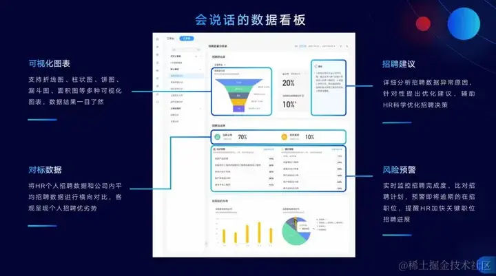 数据的重要性早已不言而喻。如今,在新兴技术的加持下,用友大易新版的仪表盘实现了更进一步的“思考”能力,它逐渐能够把整合起来的数据进行分析,并生成可视化的图表,清晰展现关键数据结果。同时系统还能基于团队或组织的标杆对比,生成智能化的分析和洞察。比如,借助「人才结构看板」,HR能分析进入offer环节的候选人画像,这些数据在人才需求的制定、组织结构多样性的盘点上都能有诸多洞察和帮助,助力HR基于数据进行更客观睿智的决策,明晰和巩固自身的战略伙伴地位。