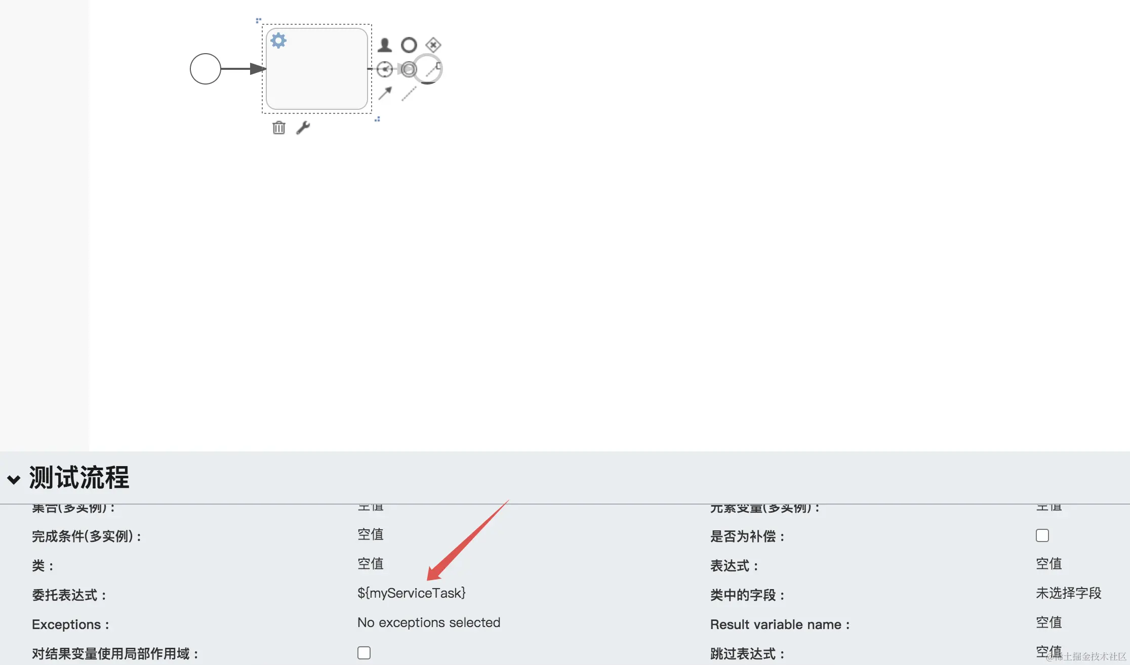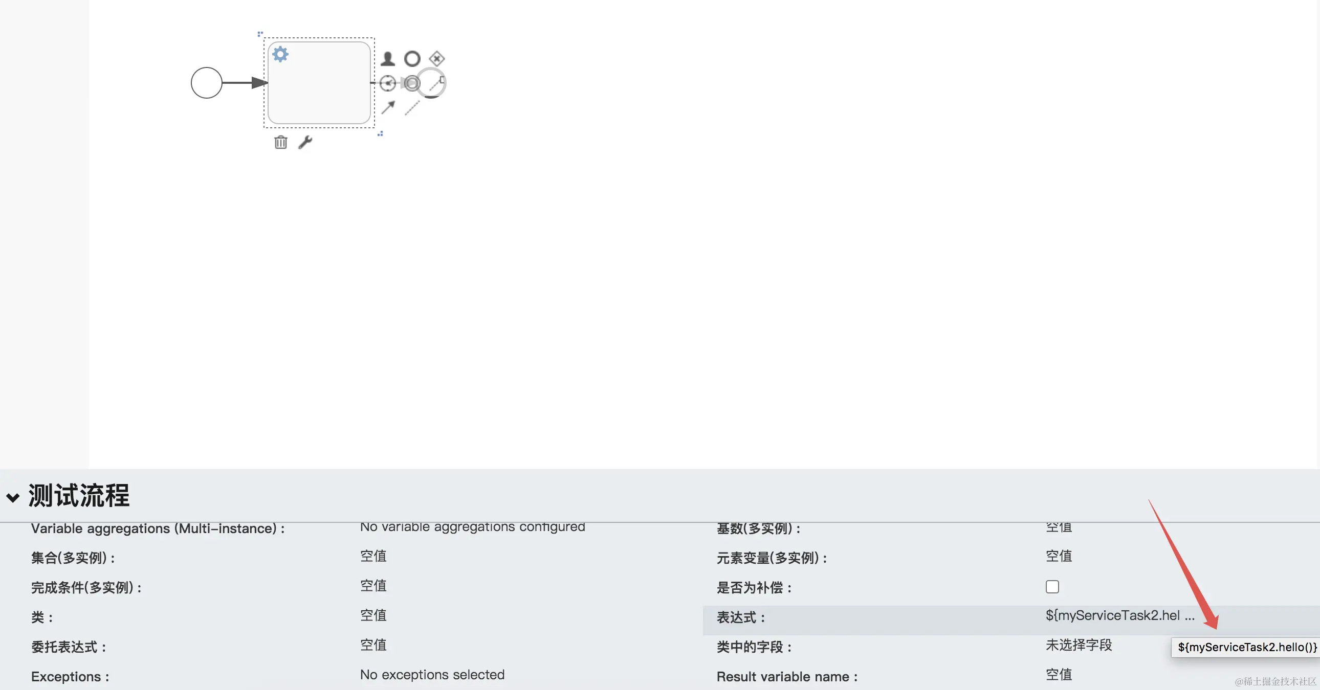 表达式中有一部分内容隐藏了,完整的表达式是 ${myServiceTask2.hello()}。