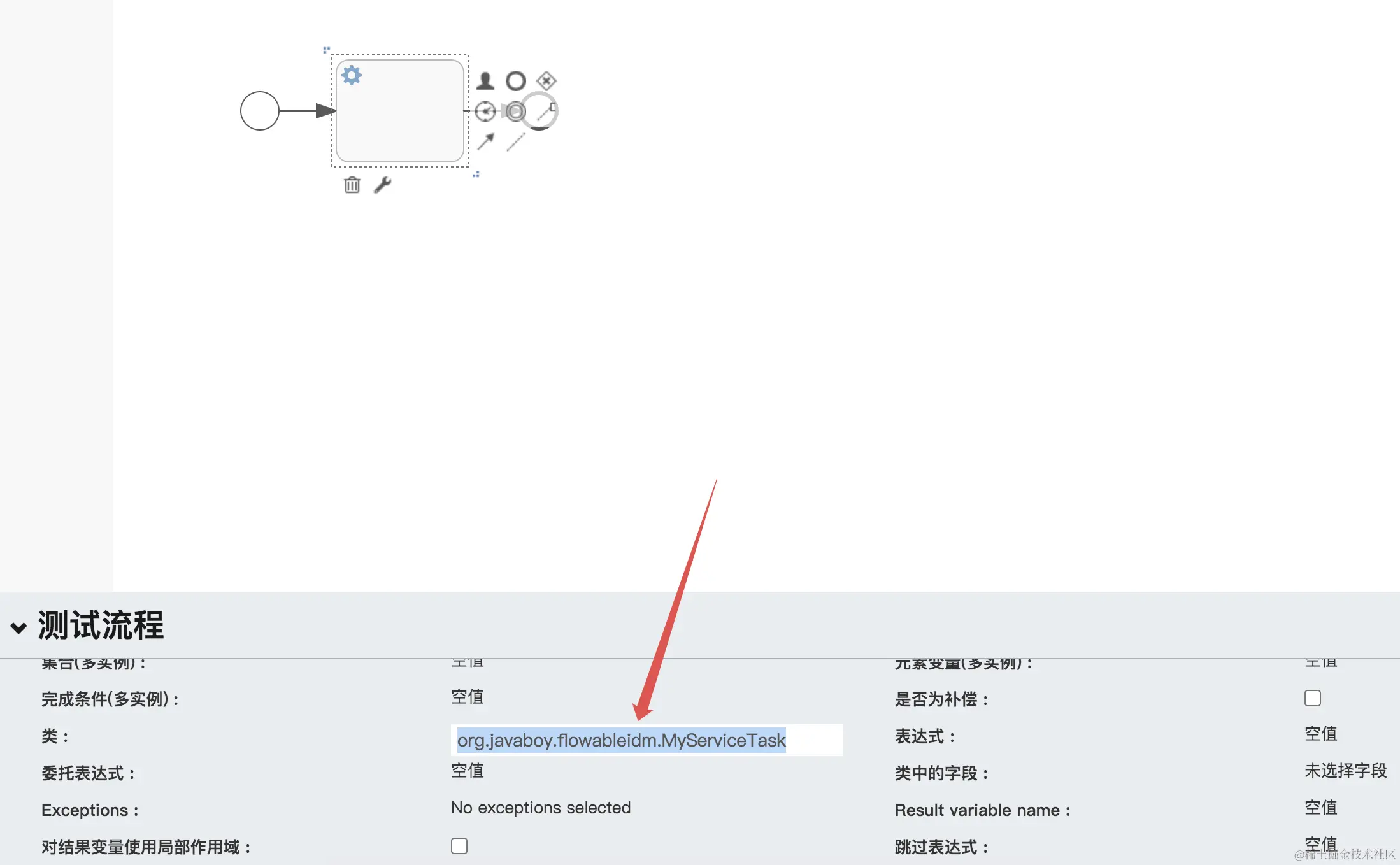 这个类定义好之后,接下来我们在流程定义的时候,配置这个类的全路径即可,如下图: