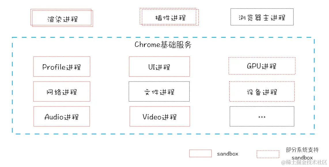 不过Chrome的发展是滚滚向前的,相较之前,目前的架构又有了很多新的变化。我们先看看最新的Chrome进程架构,你可以参考下图