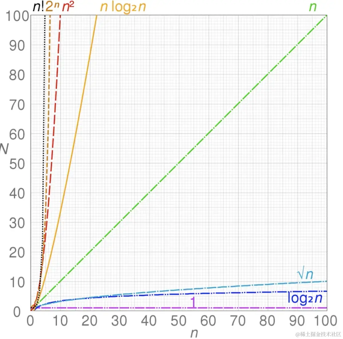 简单来说,时间复杂度就是一个函数,与其他函数所不同,它是用大写的 O 来表示的,比如说 O(1)、O(n)、O(log n) 等等。时间复杂度用来定性描述该算法的运行时间,强调定性表示,即描述大致的运行时间趋势。