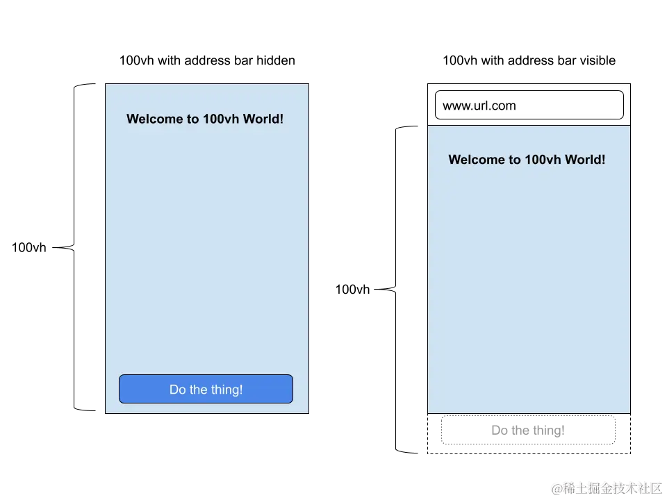 核心问题是移动浏览器(Chrome 和 Safari)有一个“有用”的功能,地址栏有时可见,有时隐藏,从而改变视口的可见大小。这些浏览器并没有随着视口高度的变化而将高度调整100vh为屏幕的可见部分,而是将100vh地址栏设置为隐藏地址的浏览器高度。结果是,当地址栏可见时,屏幕的底部将被切断,从而违背了100vh最初的目的。