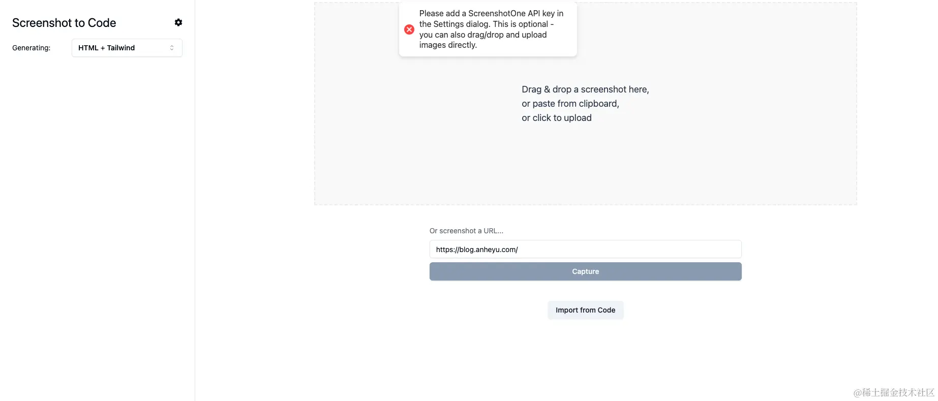 Screenshot to Code 提供了在线使用环境,可以直接上传图片并执行:screenshottocode.com/