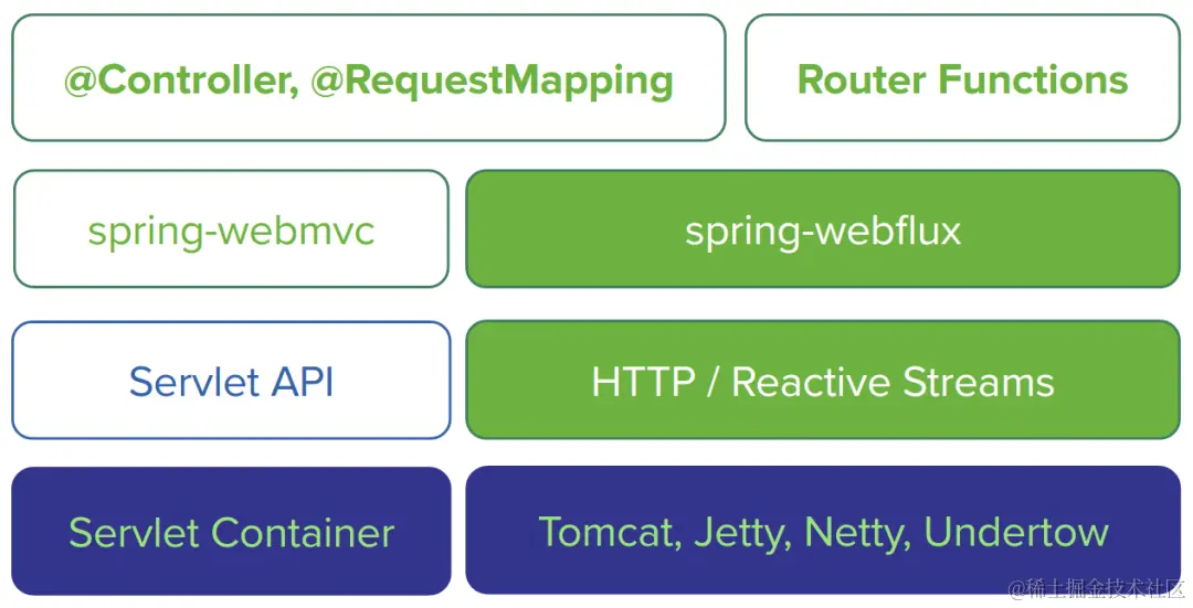 - ? 仔细看第一层的两个框框,分别是上面提到的 WebFlux 的两种编程模型。表达的是 SpringMVC 不支持 Router Functions 方式,而 WebFlux 支持。
