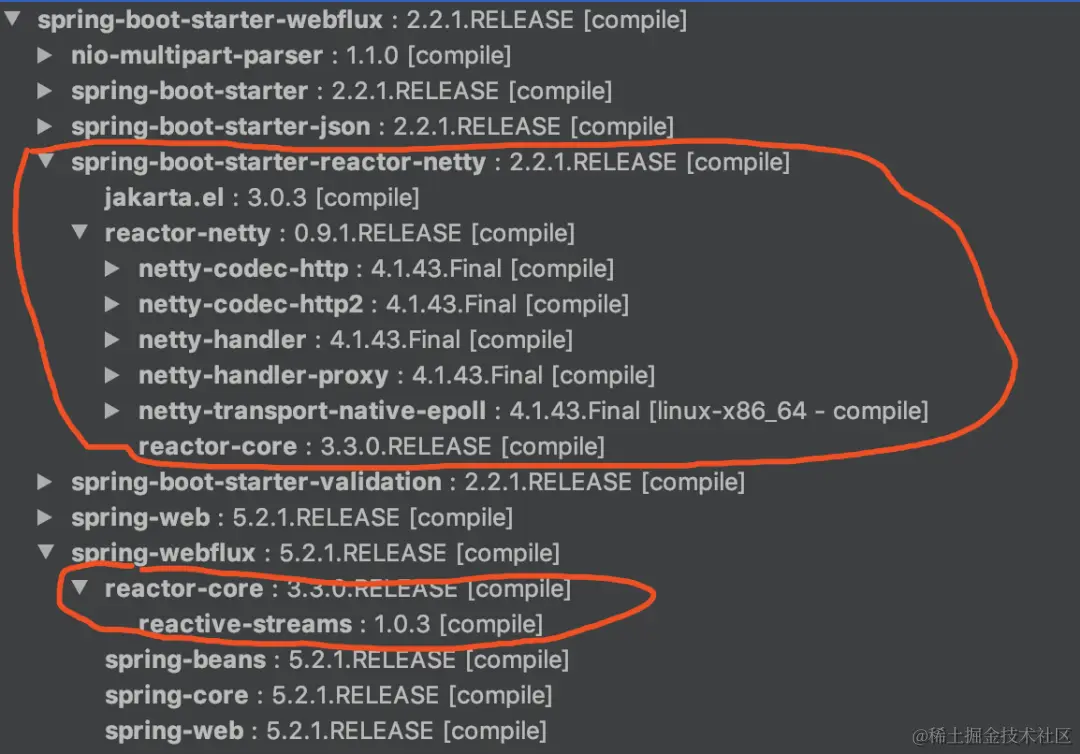 我们使用 IDEA Maven 插件 ,查看下 spring-boot-starter-webflux 依赖中,所引入的依赖。如下图所示: