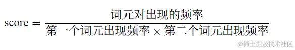 由于Google 并没有发布其WordPiece 算法的官方实现,HuggingFace 在其在线NLP 课程中提供了一种更直观的选择度量方法:一个词元对的评分是根据训练语料库中两个词元的共现计数除以它们各自的出现计数的乘积。计算公式如下所示: