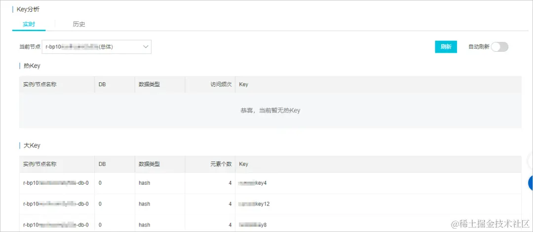 这里以阿里云 Redis 为例说明,它支持 bigkey 实时分析、发现,文档地址:www.alibabacloud.com/help/zh/aps… 。