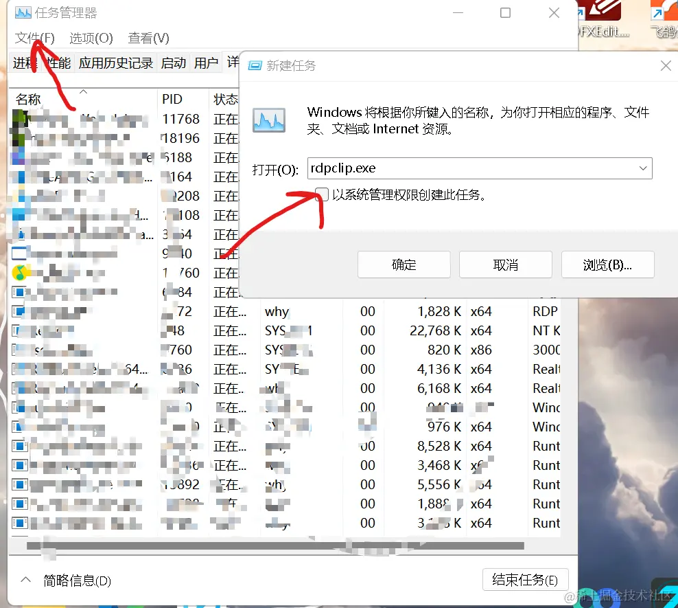 解决windows系统向linux系统(centos7)无法复制粘贴的问题(亲测有效) 生姜馅汤圆 2023-12-19 464 阅读1分钟 问题 在window系统上搜索的linux命令时,复制的东西粘不上去,粘贴后的文本和复制前不一样 后来查找后发现,只要启动rdpclip.exe就行了 解决方案 在任务管理器中 -----》左上角的“文件”点击运行新任务 ------》在弹出的新建任务输入“rdpclip.exe”. 要是发现已经rdpclip.exe启动了但是复制不了,就结束任务然后重启rdpclip。