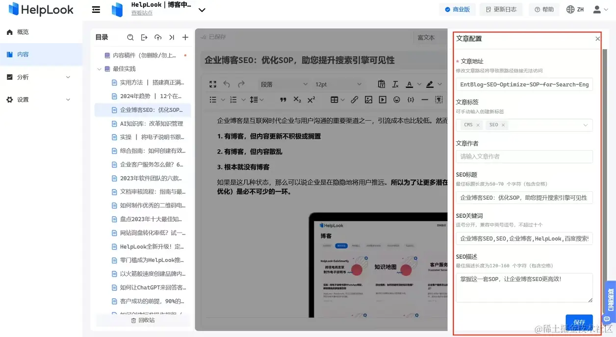使用 SEO 友好工具: HelpLook是一个可以创建企业博客、帮助中心、产品说明书等内容站点的CMS工具。
