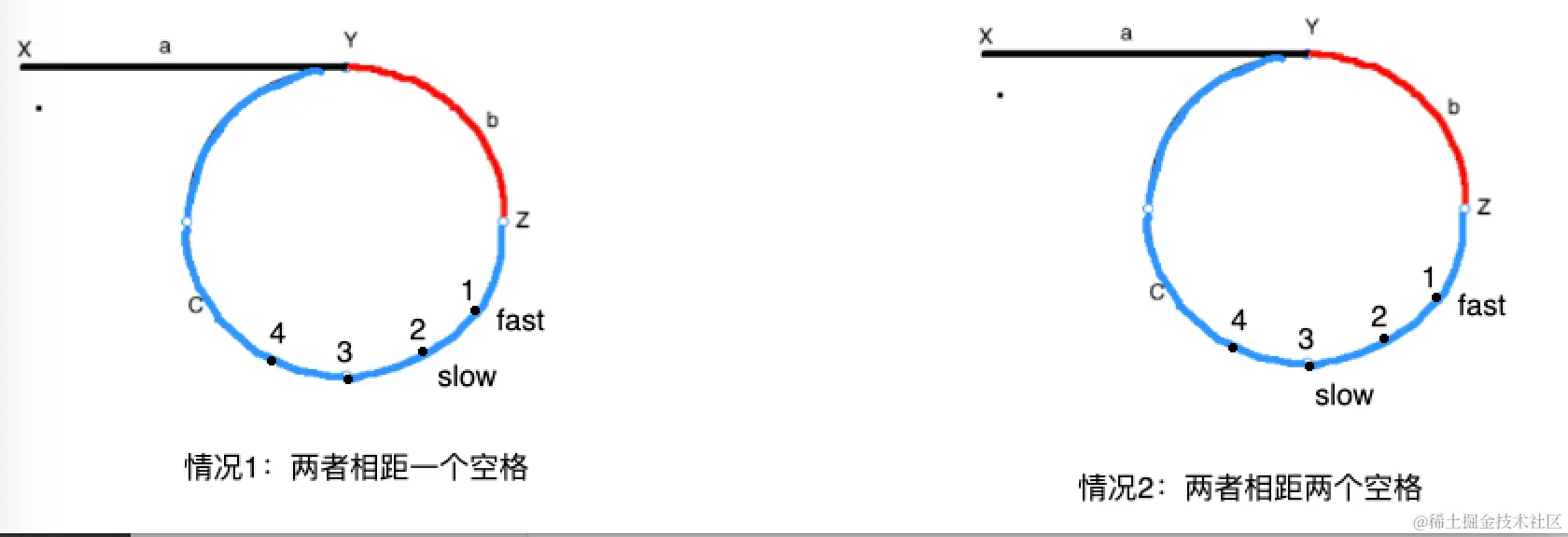 - 假如有两个空格,如上图情况2所示,fast下一步到达3,而slow下一步到达4,这就变成了情况1了,因此只要有环,一定会相遇。