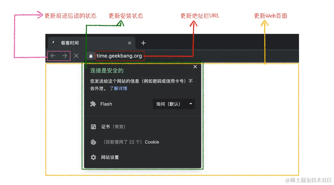 - 浏览器进程在收到“确认提交”的消息后,会更新浏览器界面状态,包括了安全状态、地址栏的URL、前进后退的历史状态,并更新Web页面。
