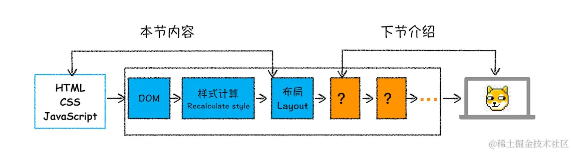 从图中可以看出,本节内容我们介绍了渲染流程的前三个阶段:DOM生成、样式计算和布局。要点可大致总结为如下: