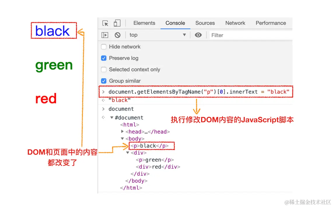 这行代码的作用是把第一个<p>标签的内容修改为black,具体执行结果你可以参考下图: