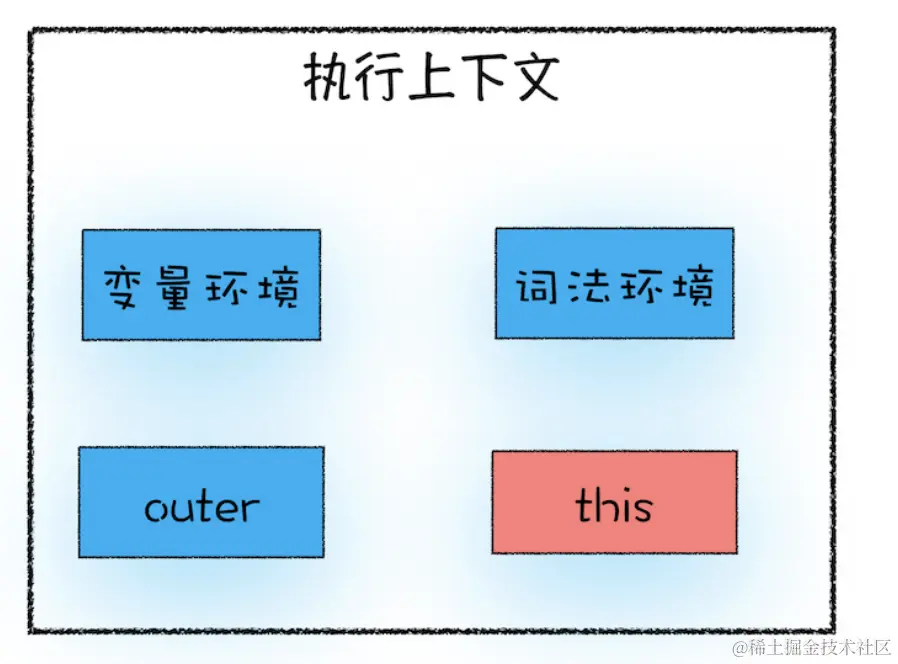 关于 this,我们还是得先从执行上下文说起。在前面几篇文章中,我们提到执行上下文中包含了变量环境、词法环境、外部环境,但其实还有一个 this 没有提及,具体你可以参考下图: