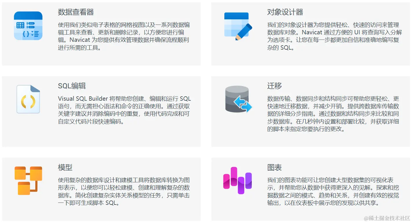 - MySQL Workbench: 由MySQL官方提供的官方图形化管理工具,支持数据库设计、SQL开发、管理和监控等功能。