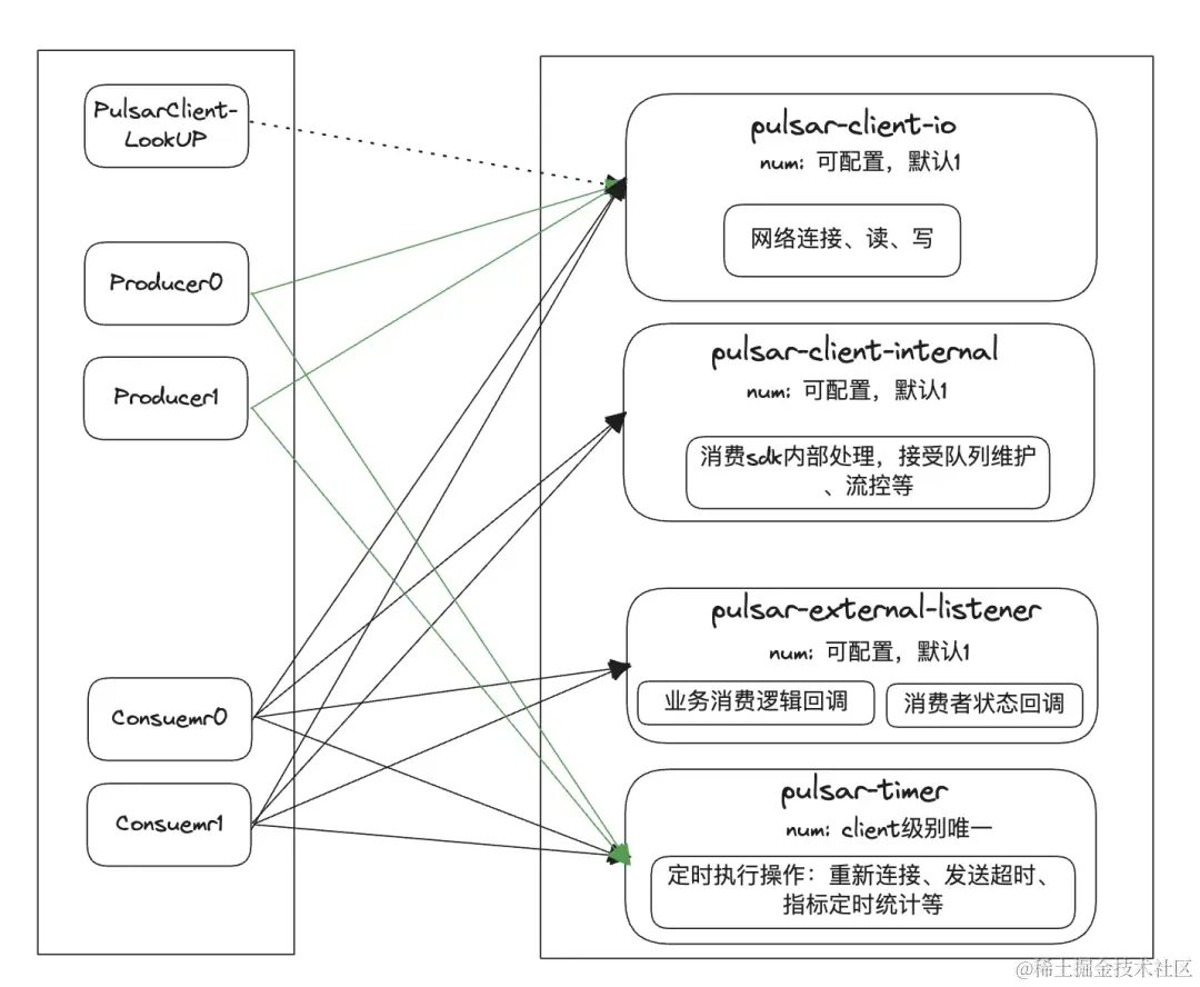 Pulsar-client-io: io 线程( Netty 内部线程),负责网络连接和读写。NumIoThreads 参数配置,默认值为1。客户端不直接绑定 IO 线程,而是由其内部的连接来绑定 IO 线程,所以 IO 线程数配置最好小于或者等于总连接数,否则有些线程不会使用到。